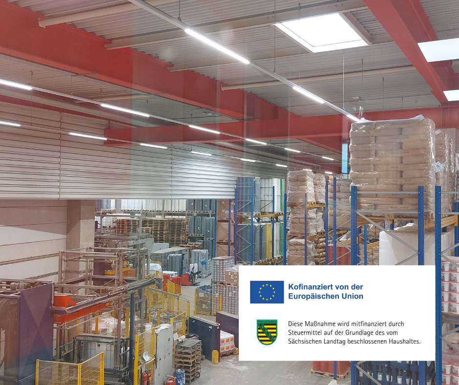 Im Rahmen des Vorhabens „Investive Maßnahmen zur Verringerung von Treibhausgas-Emissionen (in CO₂-Äquivalenten) um mindestens 20 % verbunden mit einer Steigerung der Endenergieeffizienz um mindestens 10 %“ haben wir unsere bestehende Beleuchtung vollständig auf energieeffiziente LED-Technik umgestellt.