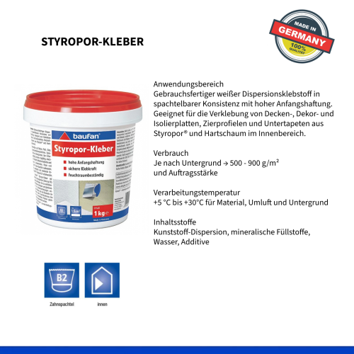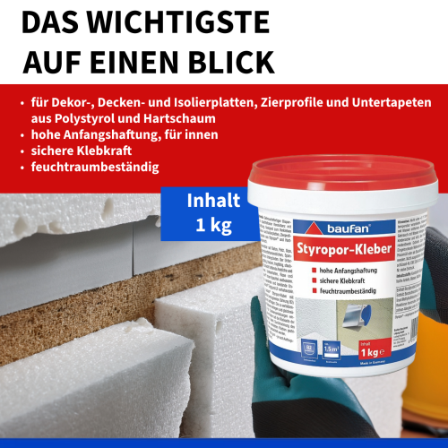 • für Dekor-, Decken- und Isolierplatten, Zierprofile und Untertapeten aus Polystyrol und Hartschaum